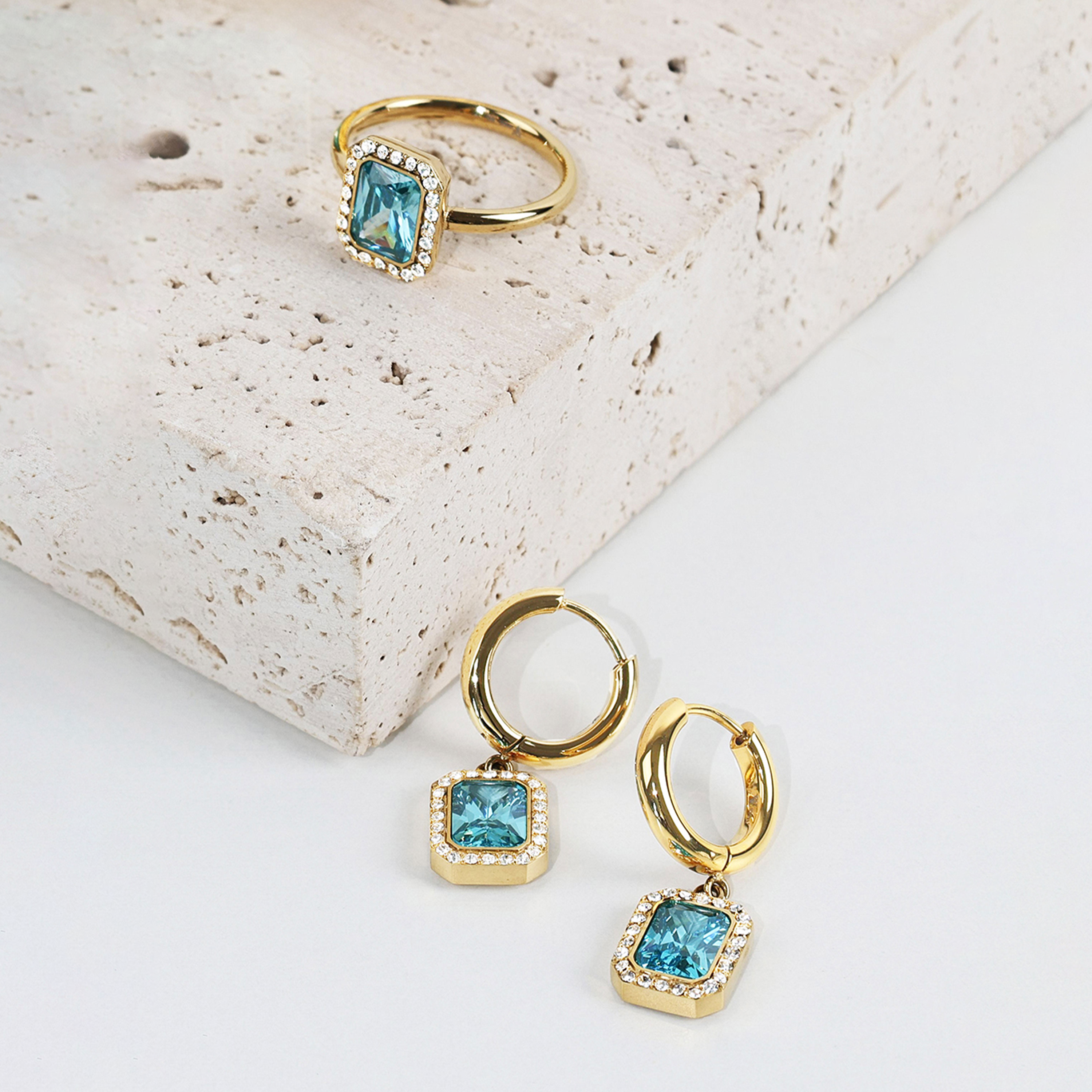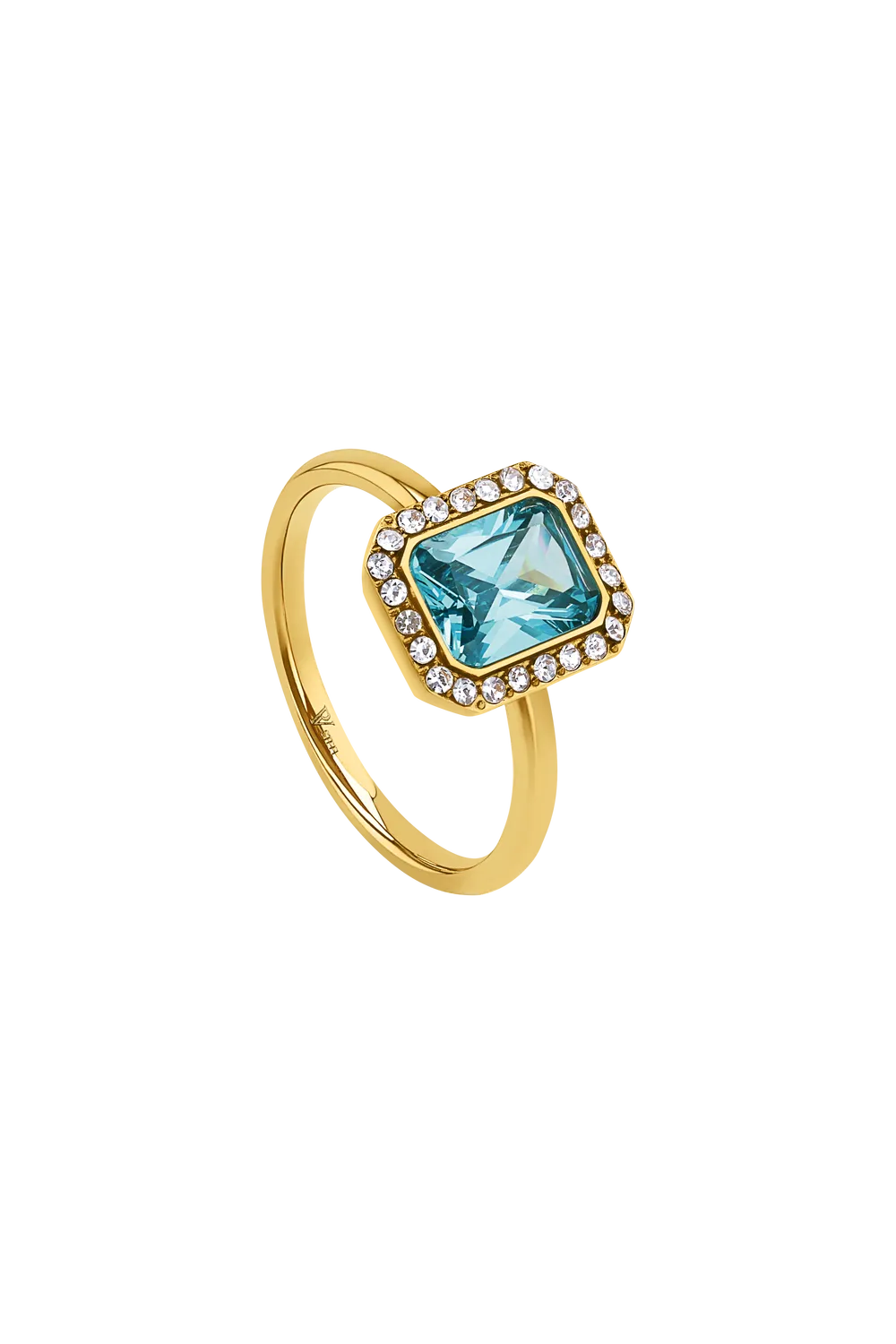 Make a lasting impression with the Pavé Blue Emerald Ring in gold. This elegant piece showcases a vivid sapphire-blue zirconia stone, encased in a halo of finely set pavé accents that shimmer with every movement. The rich gold tone enhances the depth of the blue gemstone, creating a striking and luxurious contrast. Whether worn as a standalone highlight or paired with other rings for a layered look, this ring adds refined charm to any ensemble. Perfect as a thoughtful gift or a timeless addition to your jewelry box, its classic design ensures it will be cherished for years. Available in gold and silver finishes.