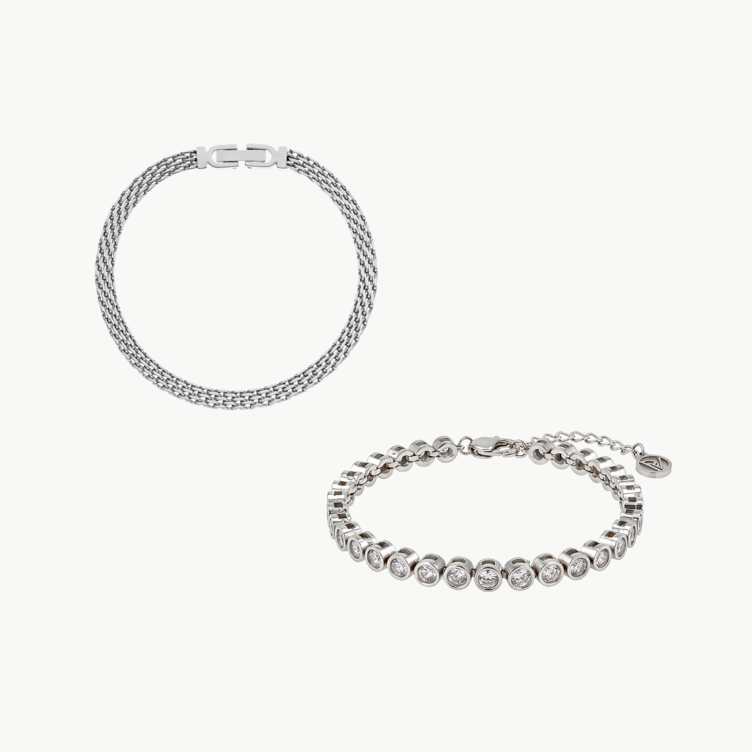 Paired with the Round Tennis Bracelet, this set introduces a refined line of shimmering stones that catch the light with every movement. The contrast between structured simplicity and subtle brilliance creates a powerful yet feminine balance.